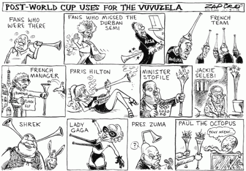 3. I Sør-Afrika er man er jo opptatt av etterbruk etter VM, akkurat som Norge var etter Lillehammer-OL. Nå handler dette jo først og fremst om etterbruk av stadion-anleggene, vekst i turisme og den slags, men det ble jo solgt en del hundretusen plasthorn under fotball-VM som nå ikke lenger er i bruk. Så derfor er man opptatt av også vuvuzelaens etterbruk. Zapiro var tidlig ute med en tegning, der etterbruken av vuvuzelaen er knyttet til ymse hendelser og personer: