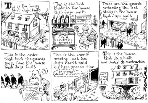Den uttalelsen ble han stevnet for av en likestillingsorganisasjon, Sonke Gender Group. Det søksmålet førte fram, og JuJu ble tidligere i år dømt til å be om unnskyldning, samt å betale en bot på R50.000 i oppreisning. Imidlertid, det virker som om JuJu ikke har hatt tid til å si unnskyld – han ble jo omtrent samtidig disiplinert av ANCs lederskap til å måtte delta på sinnemestringskurs, grunnet andre friske uttalelser – så det er klart han har hatt det travelt – og ihvertfall hadde han ikke betalt boten nå i høst. Med det resultat at politiet da måtte beslaglegge eiendeler hos Malema, for å inndrive boten. (Men de 50.000 overlevde han fint – JuJu har jo klart å samle seg en del skatter på jorden, til tross for at han er underbetalt ungdomspolitiker) Samtidig skjedde det andre ting – det skjer alltid noe rundt Malema – blant annet mistet han sine statsbetalte livvakter, og det vokser også fram en politisk motstand mot ham i ANC – og Zapiro tegnet som følger: