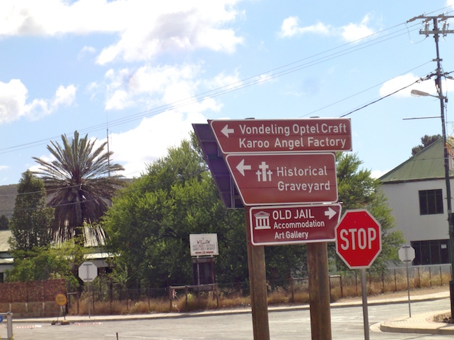 Og kronen på verket er at Vondeling endelig er satt på kartet, i form av et veiskilt. Og ikke et vanlig veiskilt – men et skilt for turistattraksjoner, satt opp av Baviaans kommune. Skiltet er splitter nytt, og vi var helt uforbredt på synet som møtte oss da vi kom kjørende inn i Willowmore seint tirsdag ettermiddag. Jeg mistet munn og mæle, rett og slett. Her er skiltet – og bildet viser samtidig et sammendrag over Willowmores turistattraksjoner: Et gammelt fengsel, en historisk kirkegård – og på toppen troner: Karoo Angel Factory.