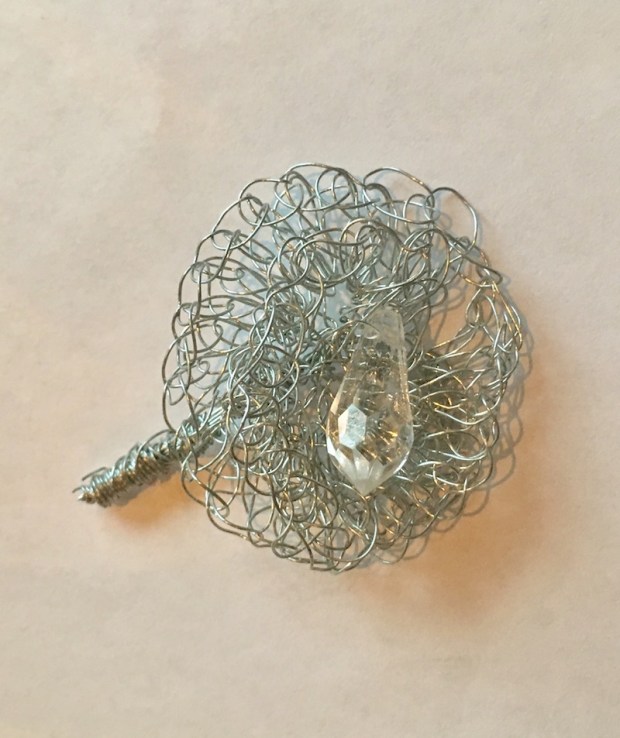 Vi hadde en helt spesiell produsent i tankene: Rietbron Craft. Denne gruppa holder til i nabolandsbyen til Vondeling, der man lager engler som verden ikke får nok av. Men i Rietbron hadde man ingen engler å lage, og de trengte så sårt noen oppdrag. Så vi gikk i gang med produktutvikling og heklet og strikket stæsj i tynn ståltråd og med en aldri så liten perle her eller der. Blant annet laget Rietbron denne – som del av en blomsterpinne: